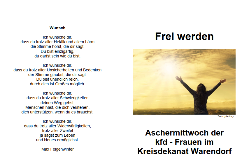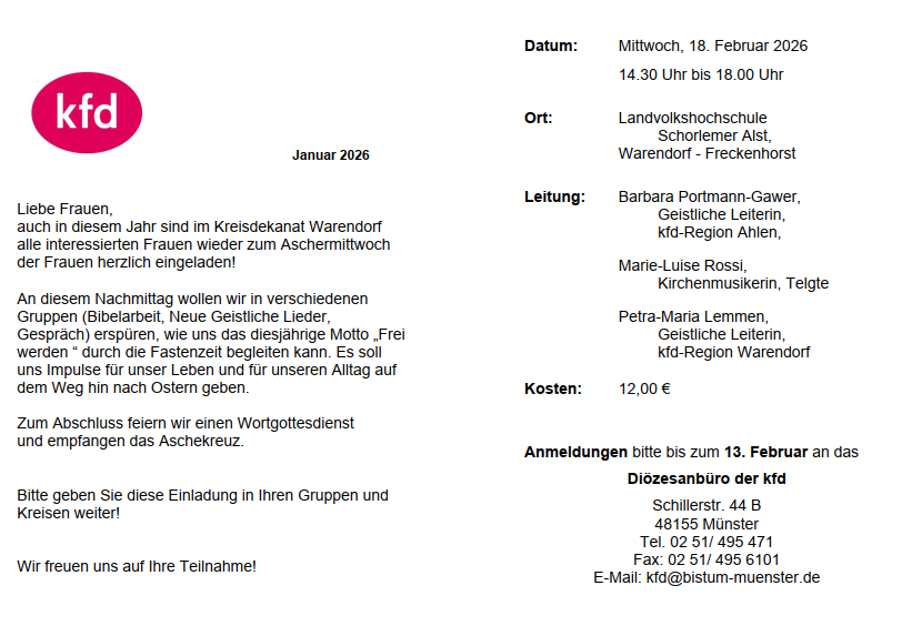 auch in diesem Jahr sind im Kreisdekanat Warendorf alle interessierten Frauen wieder zum Aschermittwoch der Frauen herzlich eingeladen!