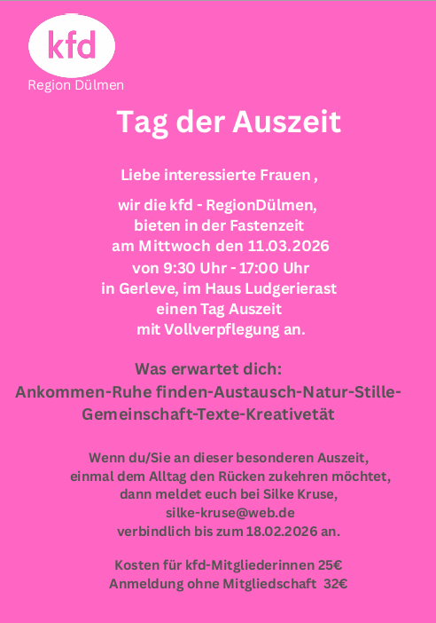 wir die kfd - Region Dülmen, bieten in der Fastenzeit am Mittwoch, den 11.03.2026 von 09:30 Uhr bis 17:00 Uhr in Gerleve, im Haus Ludgerierast einen Tag Auszeit mit Vollverpflegung an.