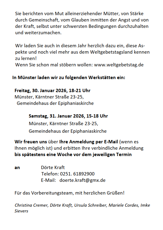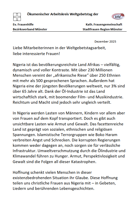 Einladung der kfd-Stadtfrauen Münster zu den Vorbereitungs-Werkstätten Weltgebetstag 2026 aus Nigeria